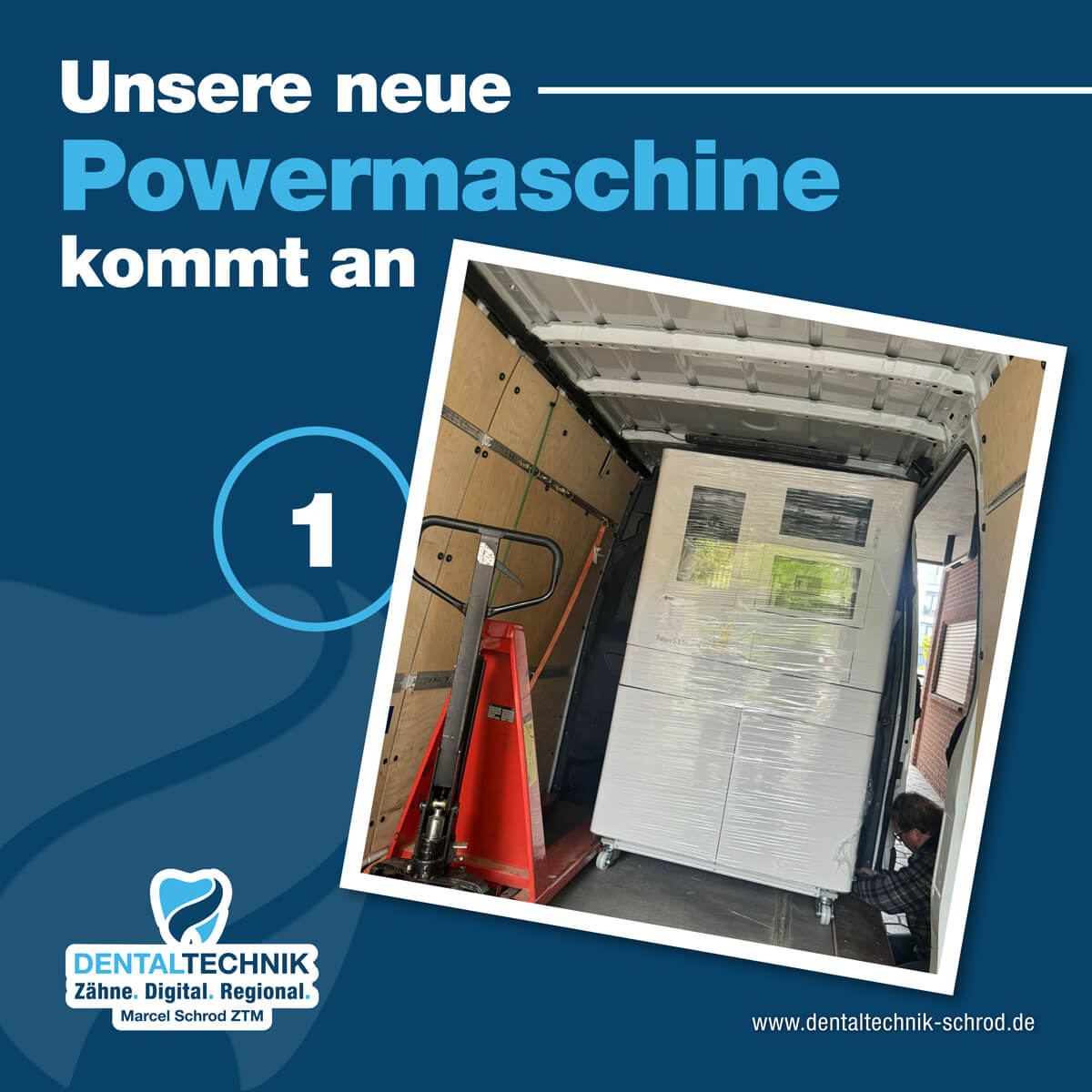 Unsere neue Powermaschine Tizian 5.5. kommt an, wurde ins Labor transportiert, im CAD/CAM-Bereich aufgestellt, angestellt und läuft!